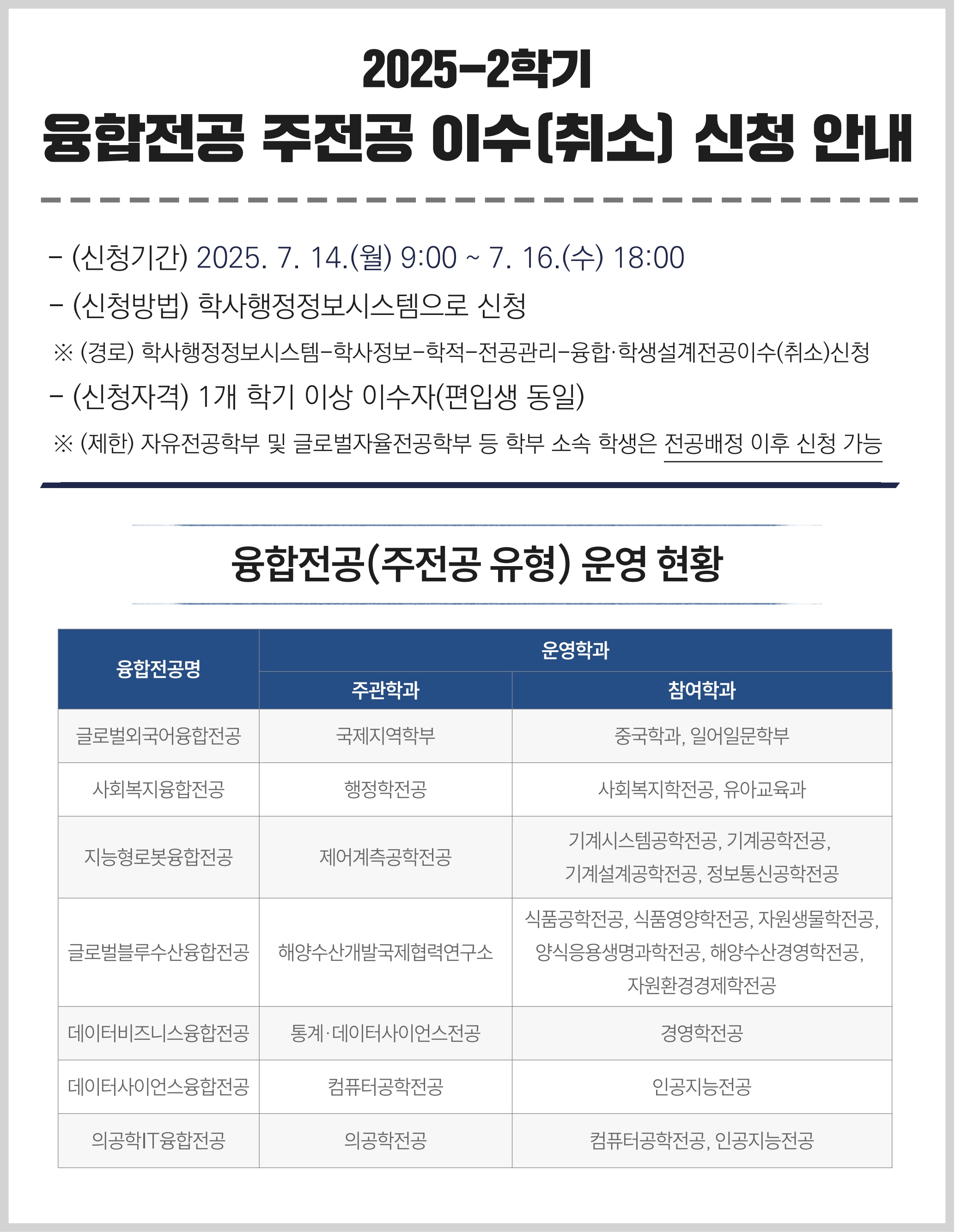 2025학년도 2학기 융합전공 주전공 이수자 선발계획