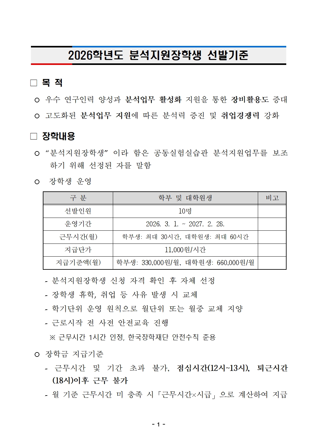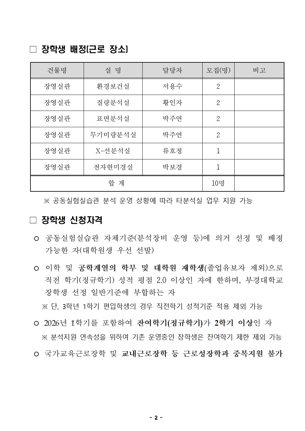 2026학년도 공동실험실습관 분석지원장학생 선발을 위한 지원자격 및 신청 일정 등을 안내하오니, 관심있는 학생들의 많은 신청바랍니다. 가. 선발인원 및 근로대상자격
