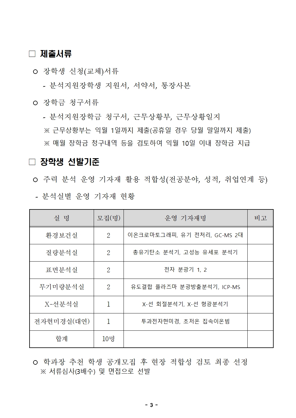 다. 선발 일정 - 지원서 접수 : 2.9.(월) ~ 2.13.(금), E-mail 접수(aey001@pknu.ac.kr) - 제출 서류 : [붙임2]분석지원장학생 지원서(지도교수 추천서 포함) ※면접시 지원서 원본제출 - 서류 심사 : 2.25.(수), 3배수 선발, 합격자 개별통보 - 면접 심사 : 3.3.(화), 대연캠퍼스 장영실관 505호 등 ※ 선발일정은 조정 및 생략될 수 있음 라. 최종 선발결과통보: 3.4.(수), 개별통보