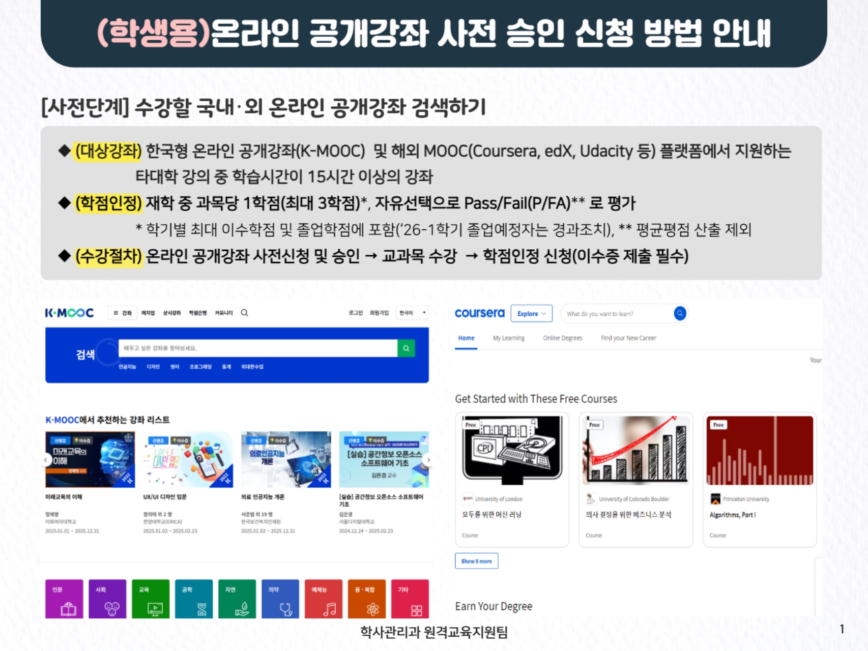 2026-1학기 온라인 공개강좌 학점인정과 관련하여 아래와 같이 사전 승인 신청 기간을 안내합니다. 관심있는 학생분들은 아래 내용을 참고하시기 바라며, 기타 궁금한 사항은 학과사무실 문의바랍니다. 가. 대상강좌: 타대학 K-MOOC 및 해외 MOOC 강좌 중 학습시간이 15시간 이상인 강좌 나. 주요내용 - 과목당 1학점, 재학 기간 중 최대 3학점까지 자유선택 학점으로 인정 - 학기별 최대 이수학점 및 졸업학점에 포함 ※ 학기별 최대 이수학점을 초과하여 신청할 경우 불이익이 발생할 수 있으므로 유의 요망 ※ 단, ‘26-1학기 졸업예정자의 경우 학기별 최대 이수학점과 관계없이 인정하는 경과조치 적용 다. 사전신청 및 승인기간