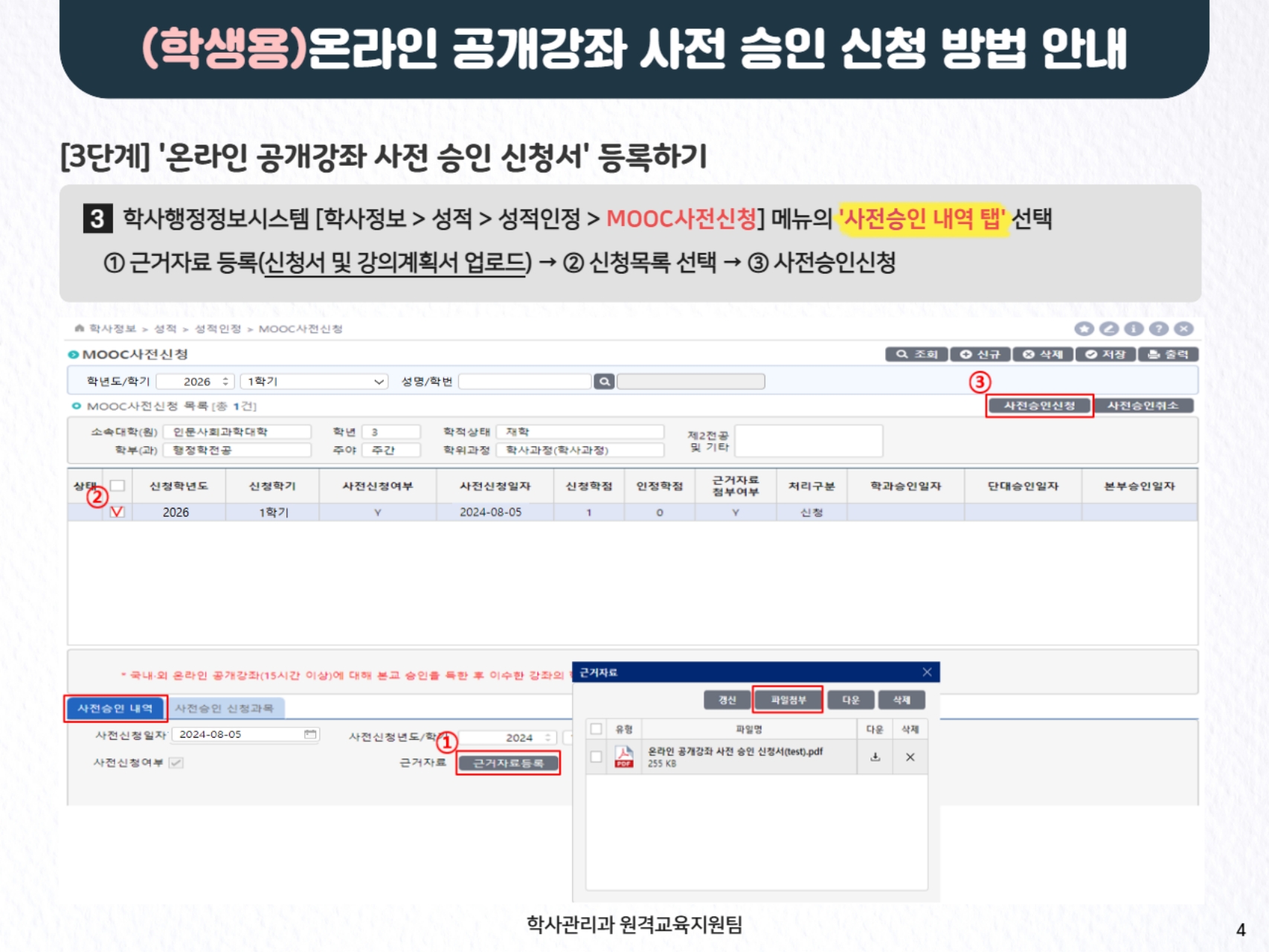 라. 신청방법: 학사행정정보시스템 [학사정보>성적>학점인정>MOOC사전신청]메뉴에서 신청 마. 향후일정 - 학점인정 신청(이수증 제출) 기간: 2026. 6. 15.(월) ~ 6. 26.(금) - 학점인정 승인일: 2026. 7. 6.(월) 예정