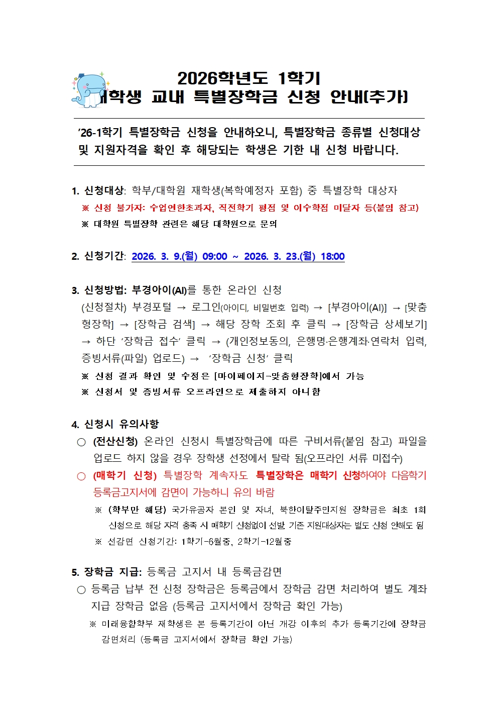 | 2026-1학기 교내 저소득층 및 특별장학생 추가 선발 안내 | |||