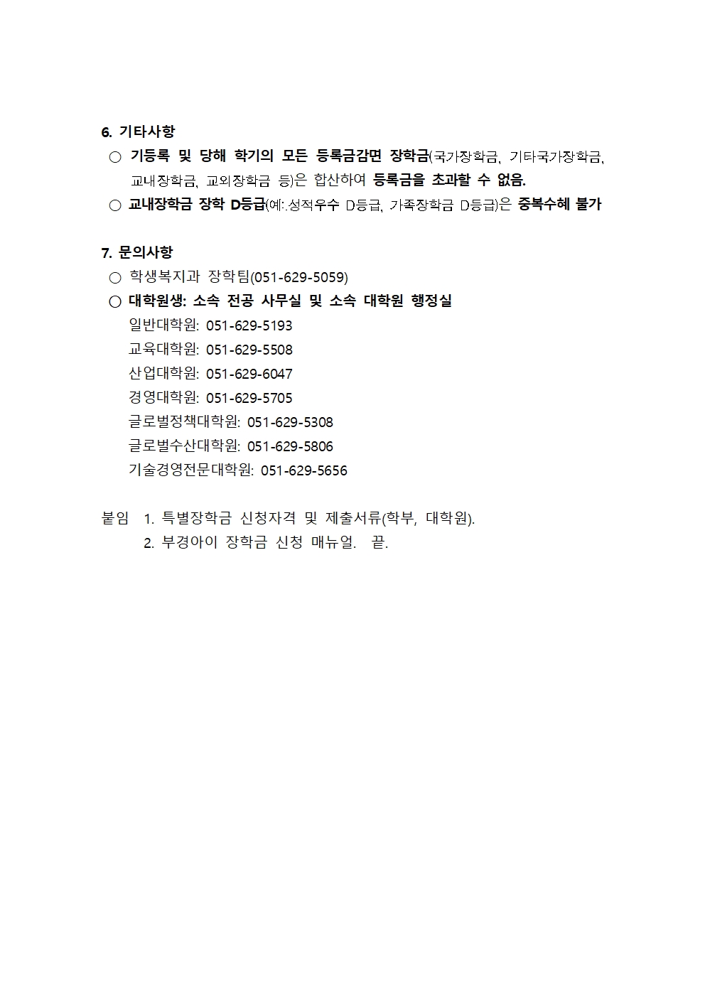 | 첨부파일 | (붙임1) 특별장학금 신청자격 및 제출서류(학부)(추가).hwp (붙임2) 부경아이 장학금 신청 매뉴얼.pdf (붙임3) 국립부경대학교 장학운영지침(개정 2023.12.27.).hwp | ||