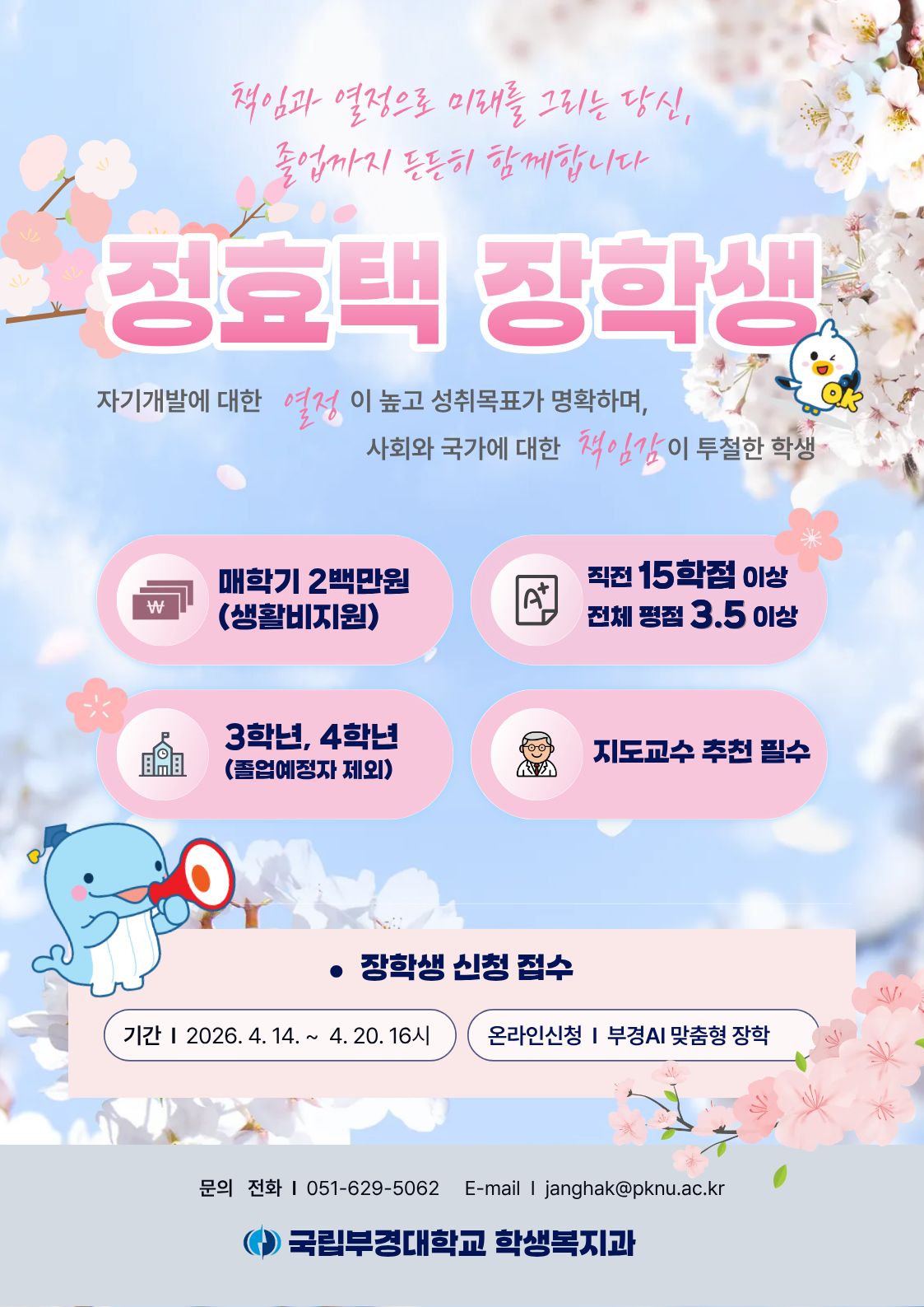 2026-1학기 [발전기금]정효택 장학생 선발 계획을 아래와 같이 안내드리오니, 학생분들의 적극 신청바랍니다. 가. 선발인원: 신규자 2명(계속지급자 제외) 나. 장학금: 학기당 2,000천원(생활보조금) ※ 단, 기타 교외장학금(국가장학금 제외)과 중복 불가 다. 지원자격(1,2,3 모두 충족필요) 1) 2026학년도 1학기에 3학년 또는 4학년 재학생(2026년 8월 졸업예정자 제외) 2) 직전학기 15학점 이상이수 3) 전체 평점평균 3.5점 이상이며, 지도교수 추천을 받은 자 라. 신청기간: 2026. 4. 14.(화) ~ 4. 20.(월) 16:00 까지 마. 신청방법(부경AI맞춤형장학 온라인) - 부경포털시스템 로그인-주요서비스 맞춤형장학(아이콘)-해당장학 클릭 - 부경포털시스템 로그인-부경AI-맞춤형장학(추천or검색)-해당장학 클릭 ※ 신청서류는 순서대로 합쳐서 1개의 파일(PDF, 파일명‘정효택장학_학번_성명’)로 업로드 바. 지원자격, 제출서류, 심사방법 등 세부사항은 붙임 모집공고 참조
