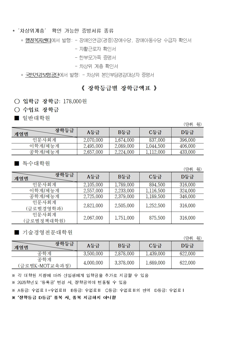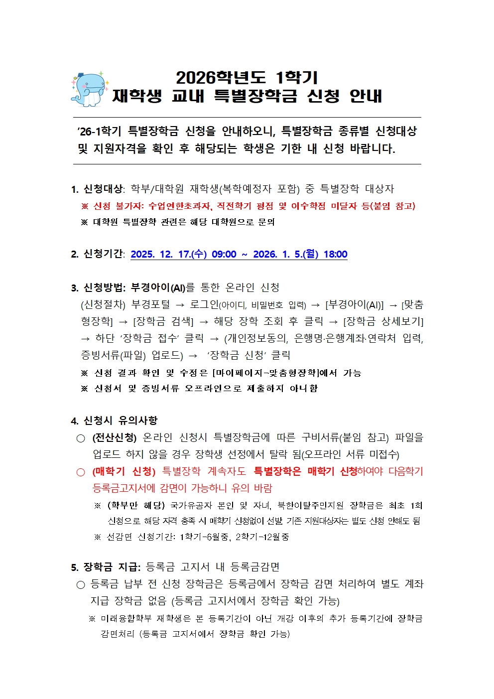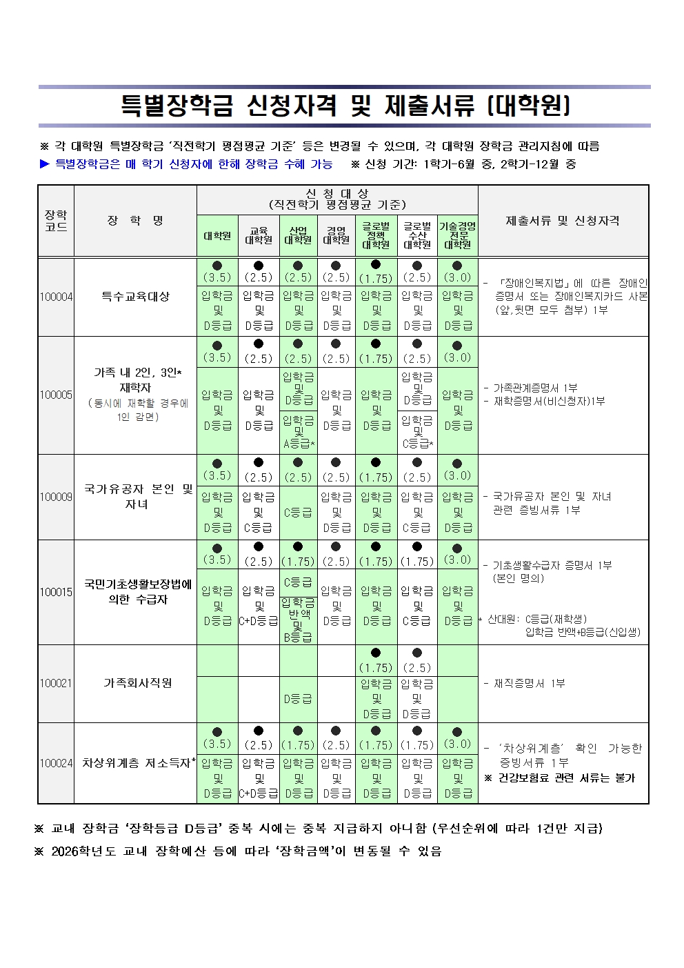 2026학년도 1학기 저소득층 및 특별장학생 선발계획 안내