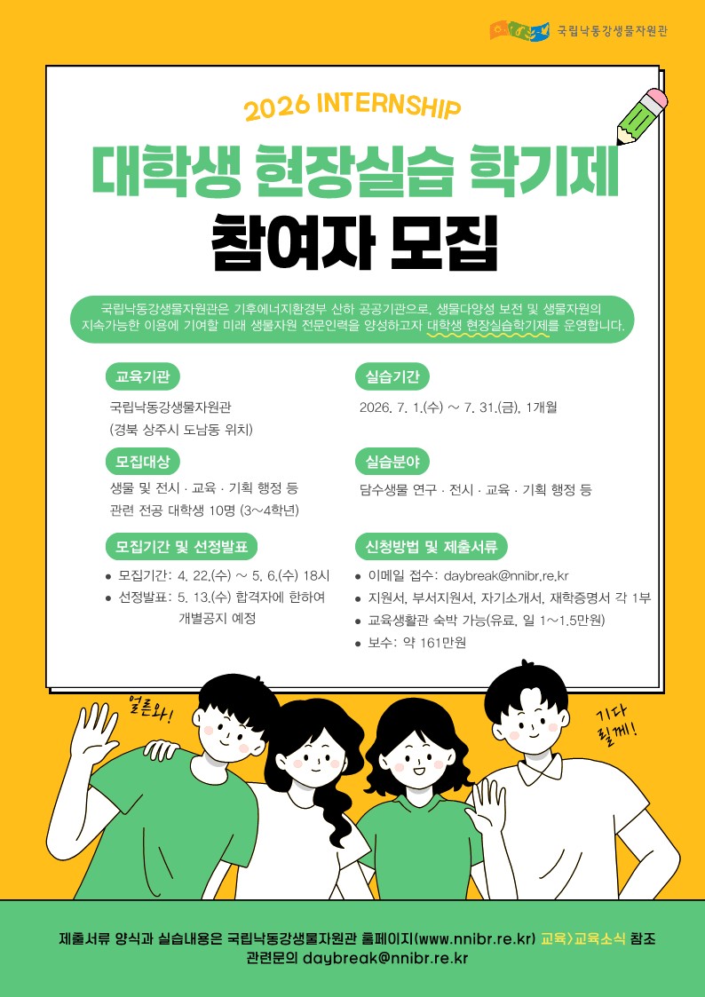 국립낙동생물자원관에서는 생물다양성 가치인식 증진 및 미래 생물자원 전문인력 양성에 기여하고자‘2026년 대학생 현장실습학기제’를 아래와 같이 운영하오니, 관심있는 학생들의 많은 참여바랍니다. 가. 실습기간: 2026. 7. 1.(수) ~ 7. 31.(금), 1개월 나. 교육장소: 국립낙동강생물자원관(경북 상주시 도남동 위치) 다. 신청기간: 2026. 4. 22.(수) ~ 5. 6.(수) 18시까지 라. 제출서류: 지원서, 부서지원서, 자기소개서(학과장 또는 지도교수 확인필), 재학증명서 또는 휴학증명서 각 1부 마. 제출방법: 이메일 접수(daybreak@nnibr.re.kr) 바. 실습수당: 약 161만원(「대학생 현장실습학기제 운영규정」에 따름) 사. 수강교과목: (표준)현장실습Ⅰ(학부 3~4학년 재적생, 하계 수강신청자에 한함) ※ 현장실습학기제 교과목 재학 중 최대 15학점까지 이수 가능